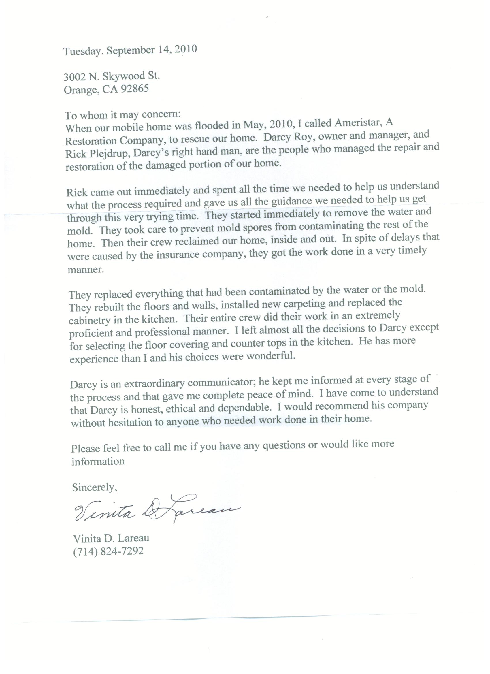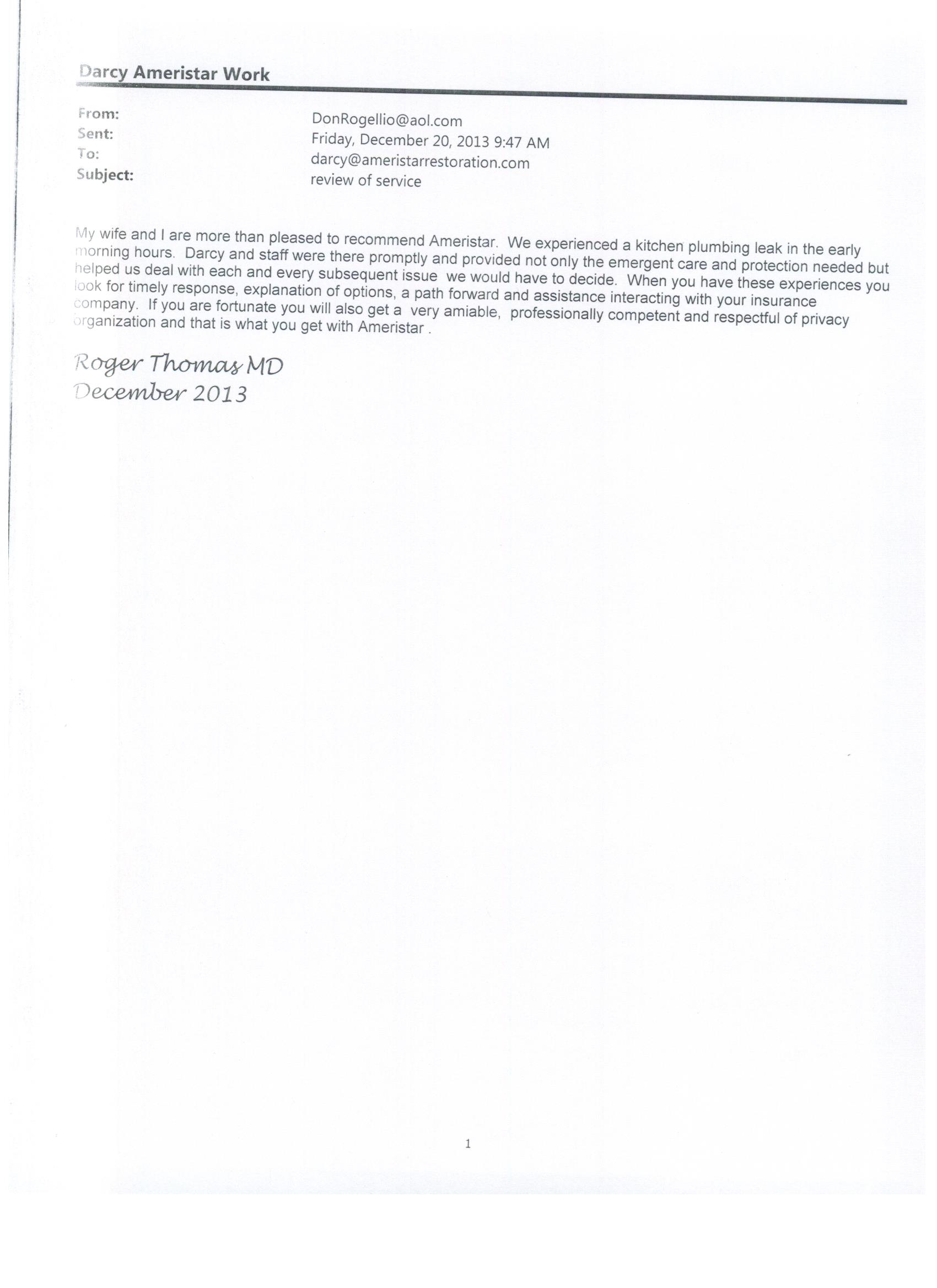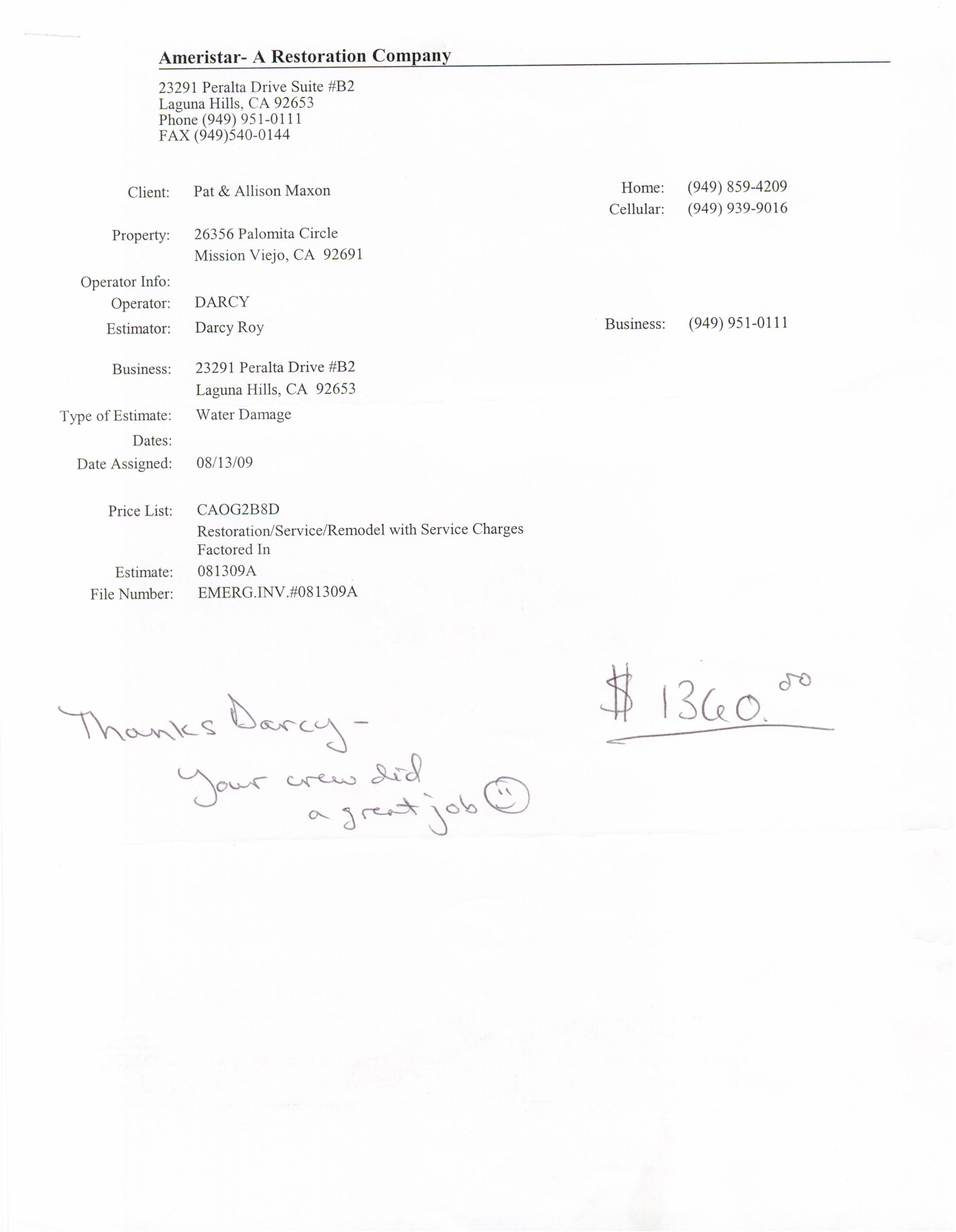 Dear Ameristar Restoration Company September 12, 2008