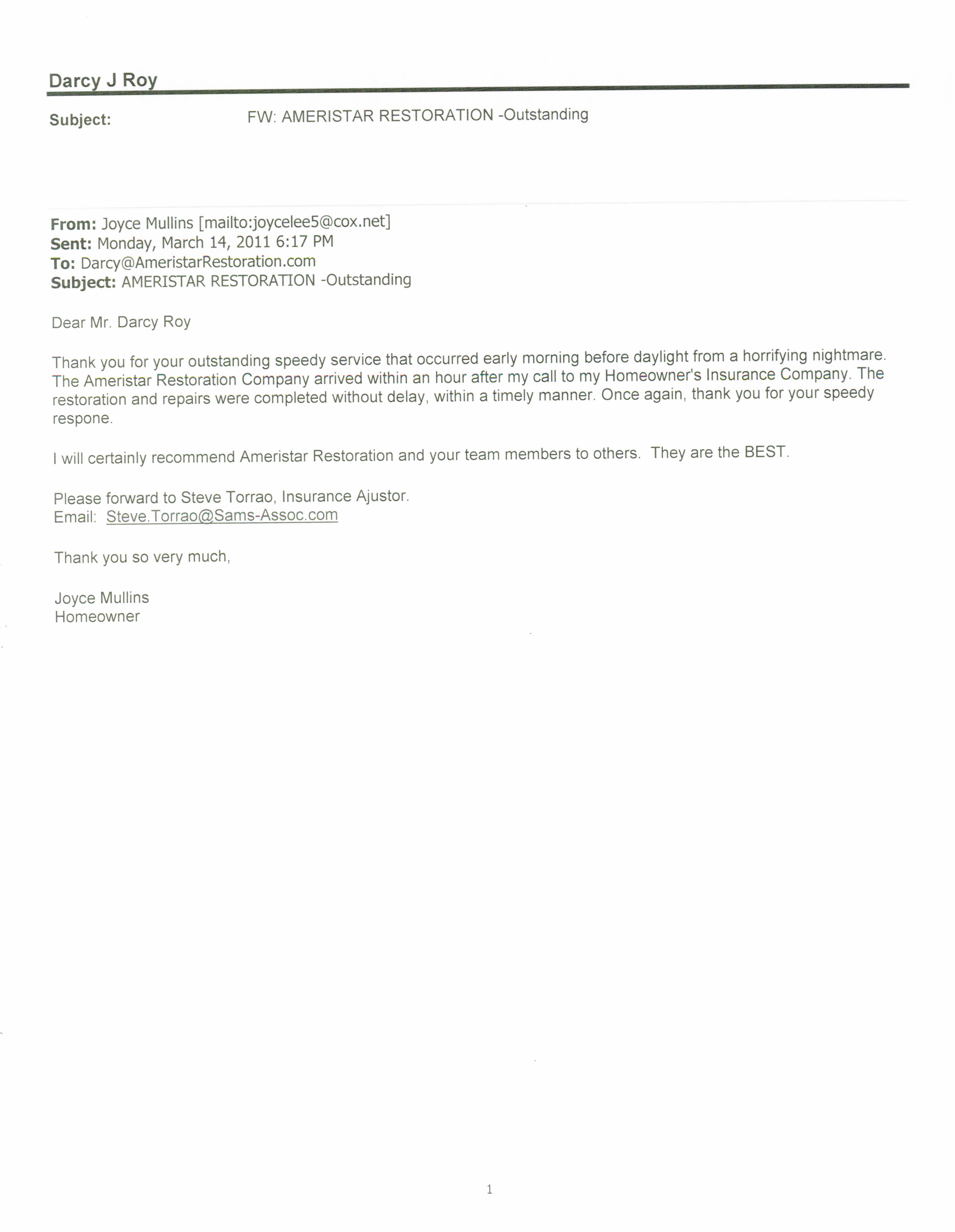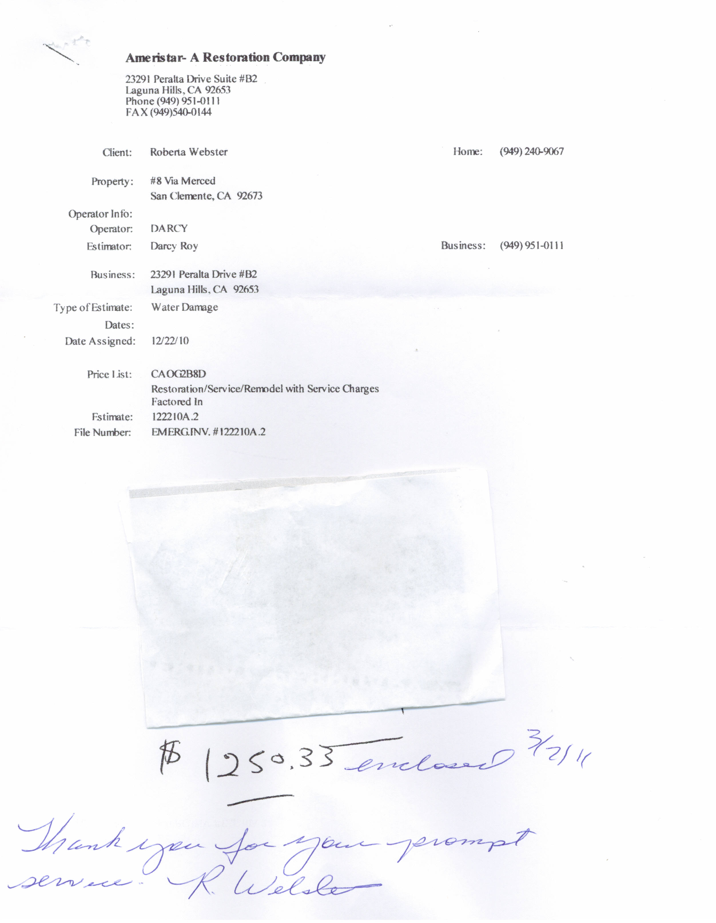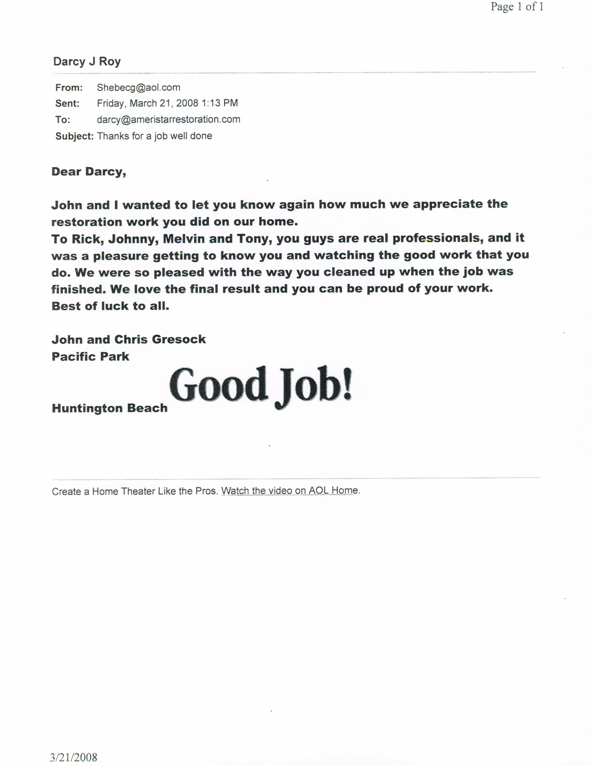 Dear Ameristar Restoration Company September 12, 2008