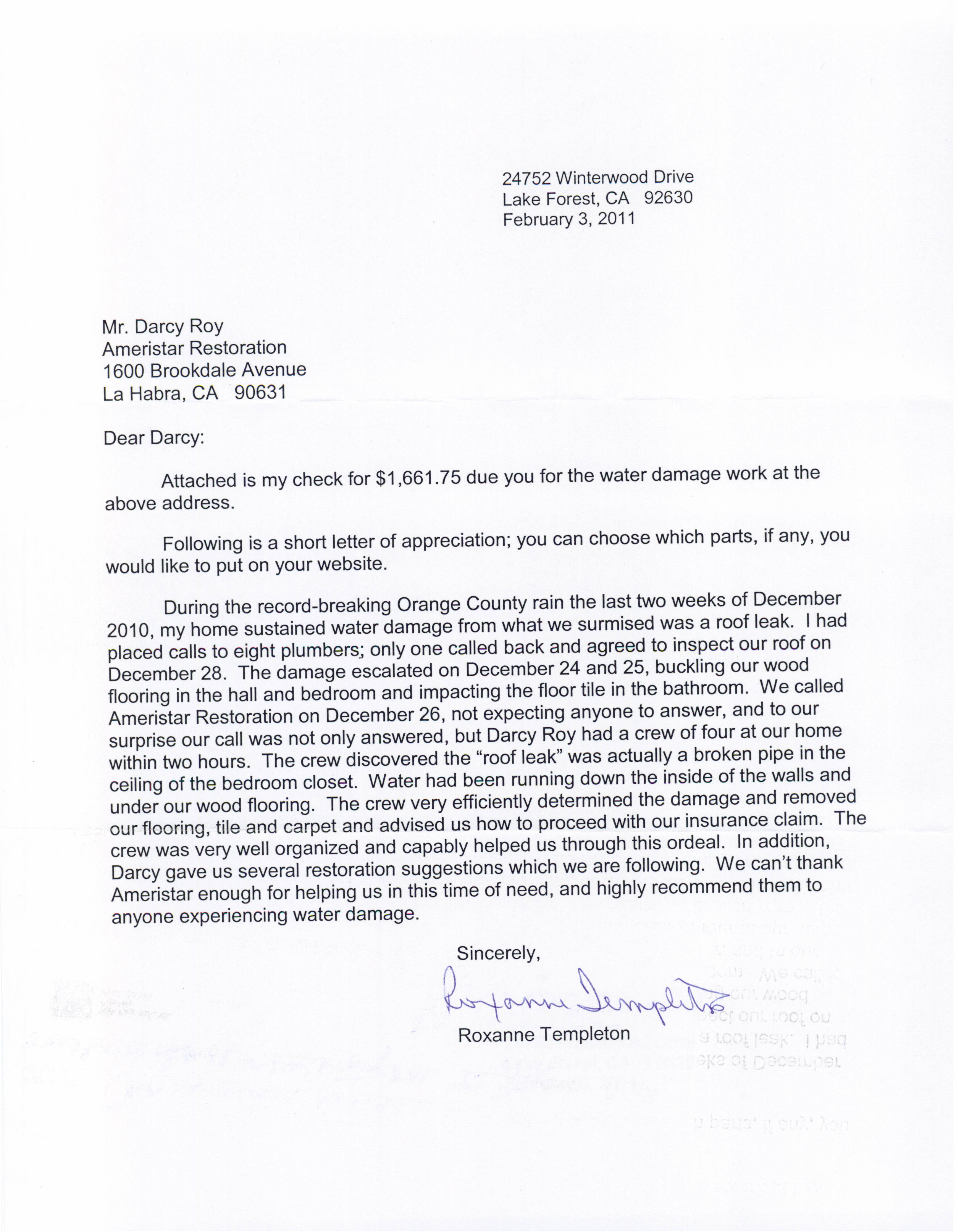 Templeton Thank You Letter